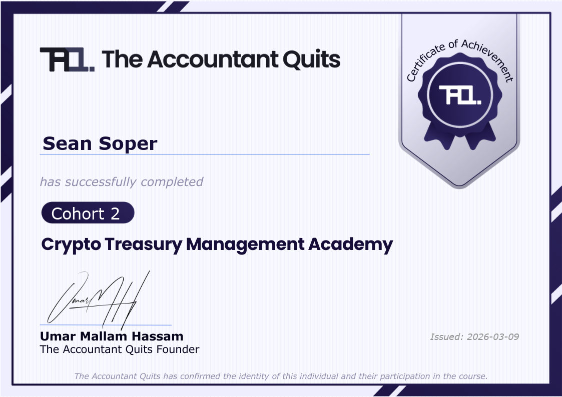 Overall, the course provided a strong overview of the strategic and operational considerations involved in managing tokenized networks and crypto treasuries. The modules effectively covered key topics such as tokenomics design, liquidity provisioning, custody frameworks, market maker dynamics, and treasury yield strategies.